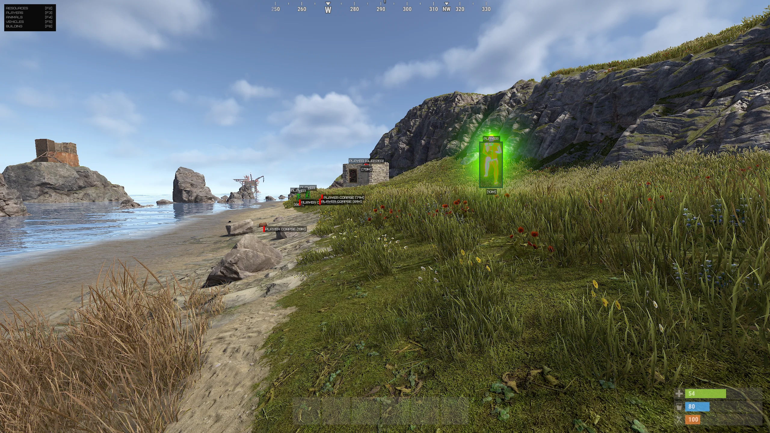 Phoenix Rust ESP предоставляет расширенный обзор происходящего в мире Rust. Отображаются игроки, NPC, животные, транспорт, контейнеры с лутом, собираемые ресурсы и ключевые объекты окружения. Это позволяет заранее планировать маршруты, избегать нежелательных столкновений и оптимизировать фарм.