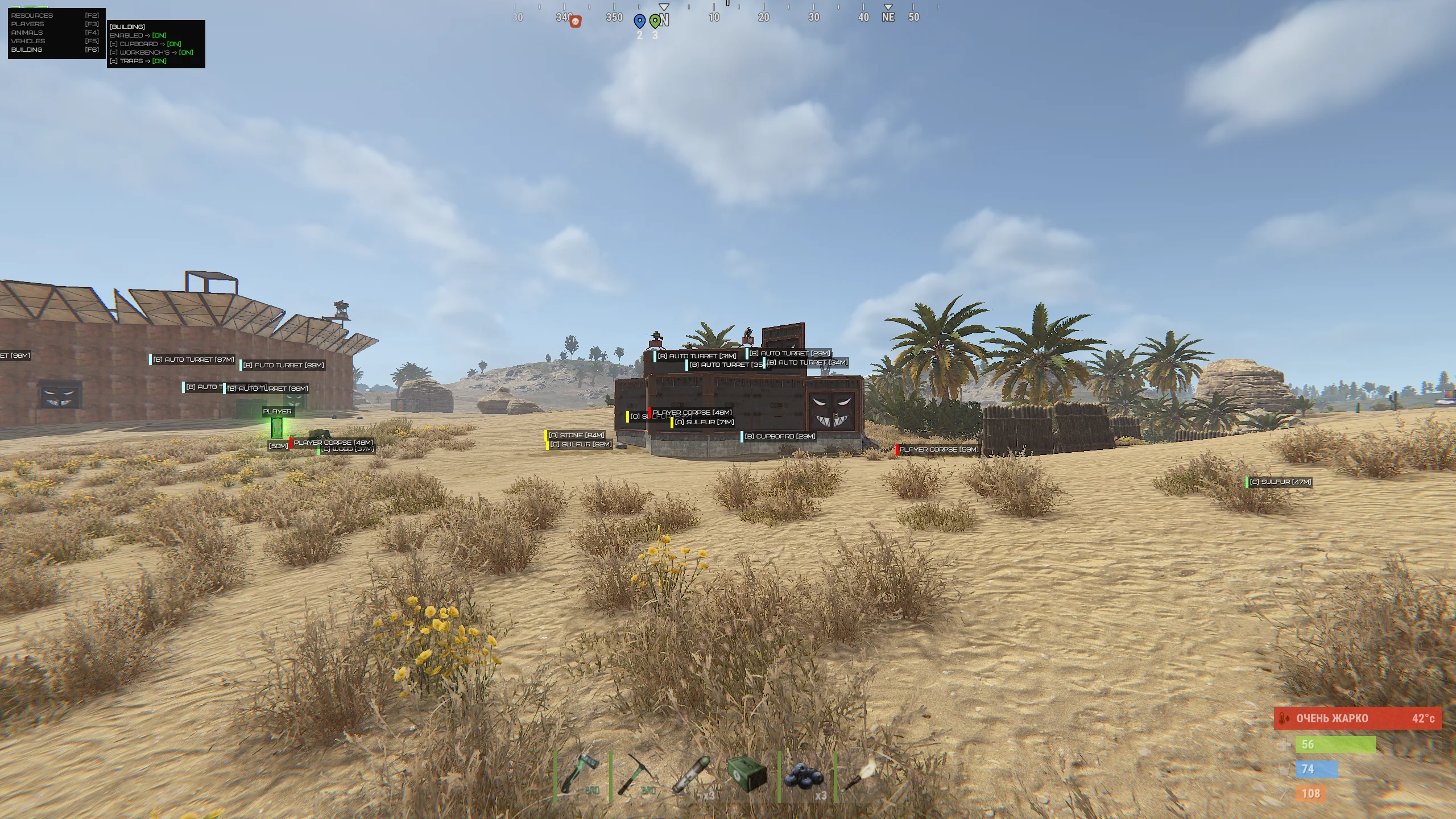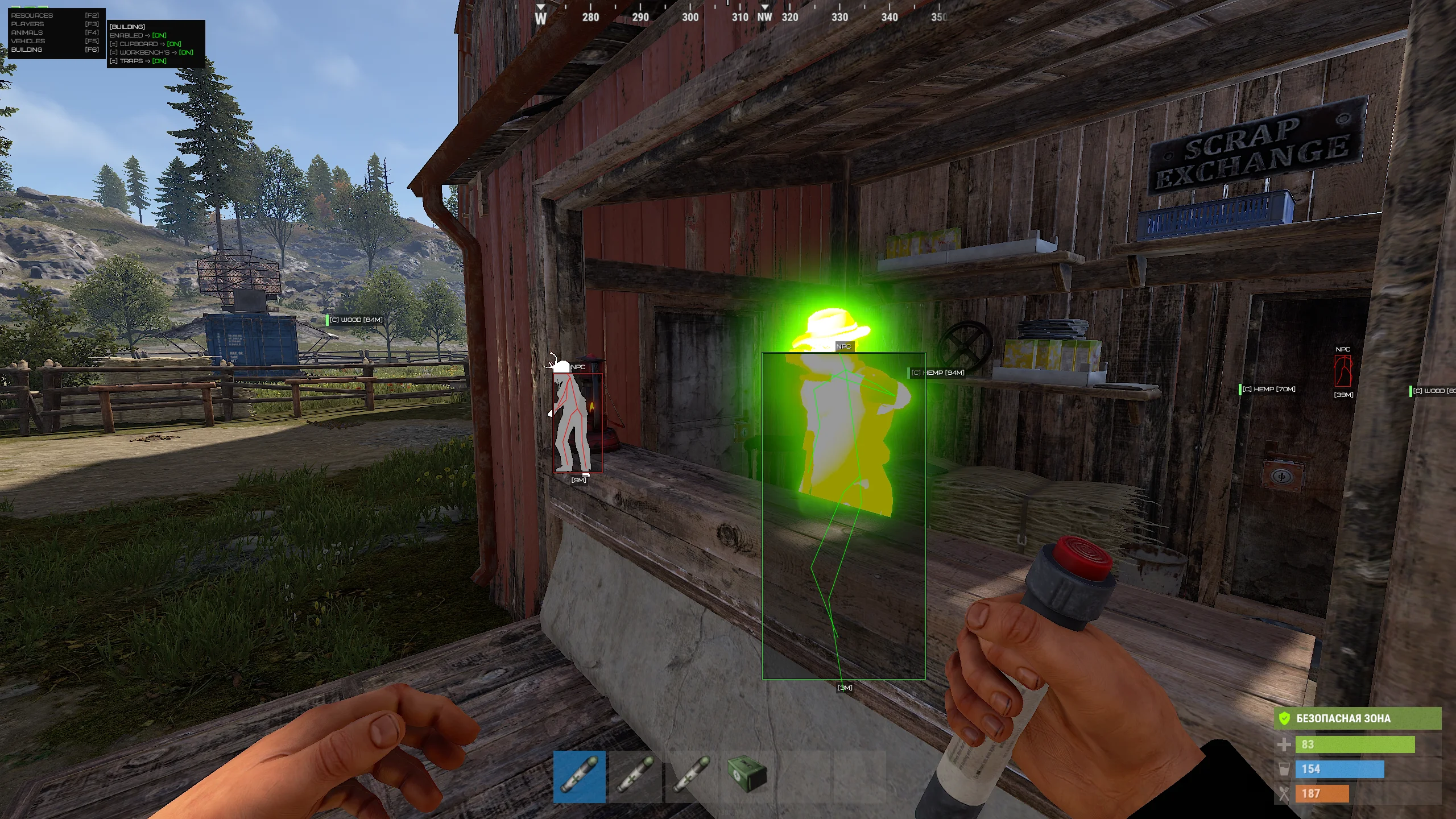 Building ESP позволяет видеть важные элементы построек: шкафы, верстаки, ловушки и ключевые объекты базы. Это особенно полезно при рейдах и разведке, когда каждая деталь имеет значение. Информация подаётся аккуратно и не засоряет интерфейс, сохраняя читаемость.